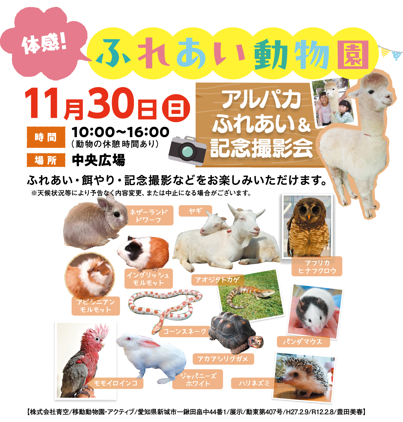 【参加予定】アルパカ、ネザーランドワーフ、ヤギ、アビシニアンモルモット、イングリッシュモルモット、アオジタトカゲ、アフリカヒナフクロウ、コーンスネーク、パンダマウス、モモイロインコ、アカアシリクガメ、ジャパニーズホワイト、ハリネズミ