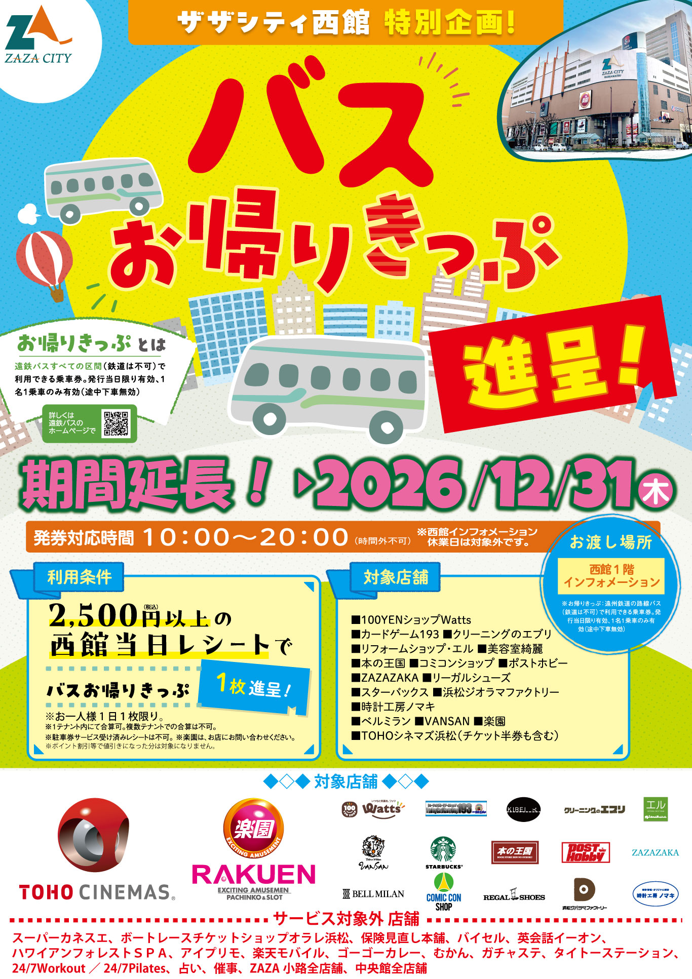◆利用条件:西館対象店舗での2,500円以上の当日レシートでバス「お帰りきっぷ」1枚進呈